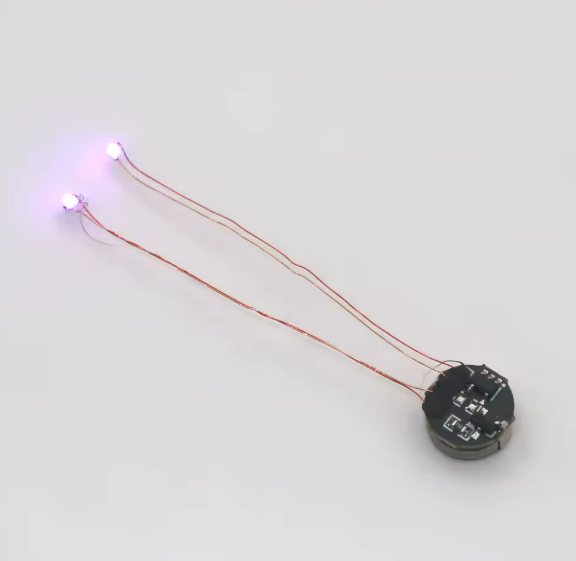 It's a tiny little light that turns on when you bring a small magnet close, and turns off the same way. Perfect for bringing amigurumi eyes to life, or for other projects like Christmas trees. The lights come individually, in pairs—as you can see in the photo—or even with more branches.